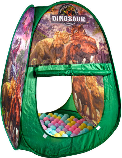 Gyerek játszósátor a dinoszauruszok világának érdekes grafikájával, amiben a gyerekeknek nagyon jól fog szórakozni.  A szenzációs sátor minden kisfiúnak vagy az őskori állatok szerelmeseinek sok szórakozást nyújt.  A sátor megfelelő hely gyermeke számára játékra vagy pihenésre. Beltéri és kültéri használatra egyaránt alkalmas, könnyen tisztítható anyagból készült.  100 labdát is tartalmaz, mellyel gyermeke kedvére játszhat.  A sátor hálós hátoldala biztosítja a jó levegőkeringést, és lehetővé teszi, hogy biztonságosan szemmel tartsa gyermekét.
