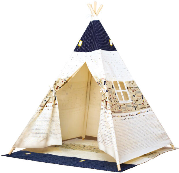 Bino TeePee játszósátor (játszóház gyerekeknek 3 éves kortól, gyerek sátor beltérre és kültérre, indián motívumokkal nyomtatva, méret 120x120x150 cm), kék-bézs | LEÍRÁS: A fantasztikus TeePee indián sátor egy gyerek sátor beltérre és kültérre. nyáron kellemes védelmet nyújt a napsütés ellen, télen pedig remek hangulatos játszósarkként használható. Ez a különleges ajándék 3 éves és idősebb gyermekek számára 4 osztott sátoroszlopból, egy kiváló minőségű, ablakkal ellátott pamutponyva és egy sátorpadlóból áll. A vonzó indián dizájn fantáziálásra és álmodozásra ösztönzi a kicsiket, miközben teljes mértékben élvezik az elvonulásban töltött időt. Minden termékünk nemzetközileg elismert vizsgáló laboratóriumok által tanúsított, és megfelel az EU biztonsági irányelveinek.