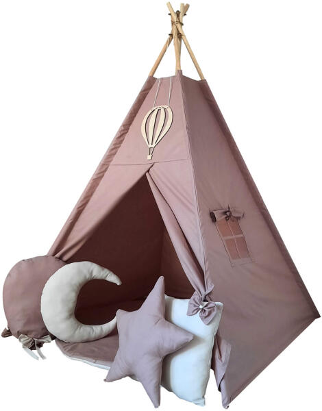 A teepee sátor egy igazi kis bunker, ahol gyermeke boldognak és gondtalannak érezheti magát. A gyerekek kreativitását növelő rózsaszín Teepee indián sátor tökéletes helyet biztosít a gyerekeknek a játékra és a pihenésre. Varázsoljon gyermekének egy varázslatos birodalmat. A sátor segítségével gyermeke szórakozhat és egyben fejlesztheti a képzelőerejét. A puha és különleges párnáknak köszönhetően pihenhet, olvashat vagy játszhat a sátorban. A rózsaszín színe miatt lányos gyerekszobába is tökéletes választás. A sátor részét képezi egy masnis párna, továbbá egy felhő, egy csillag és egy hold formájú párna is. A párnák társai lesznek gyermekének a játék során. A sátor ajtaja zsinórok segítségével kinyitható. A kis redőnyös ablaknak köszönhetően a gyerekek figyelhetik a körülöttük zajló események, mégis biztonságban érezhetik magukat a kis bunkerjukban. A sátor könnyű és könnyen áthelyezhető. A minőségi antiallergén anyagok a kényelem garanciái. A sátorhoz egy légballon dísz